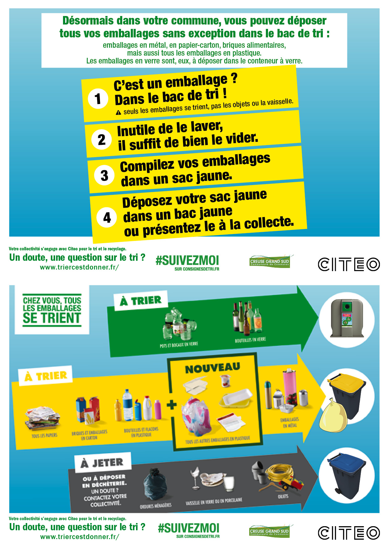 Les déchets recyclables doivent être emballés dans les sacs jaunes. Ils sont fournis gratuitement par la CdC Creuse Grand Sud et sont à disposition au secrétariat de la mairie de Saint Sulpice ou à l’agence postale.